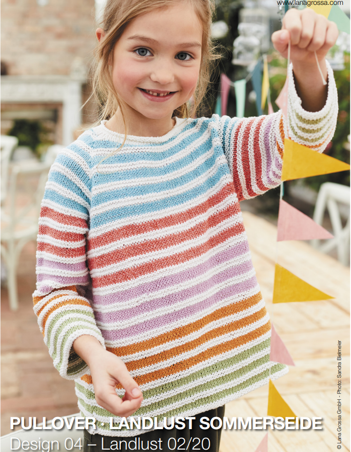 Materials: 150 (150, 200) g of Lana Grossa Landlust Sommerseide (50% silk, 50% cotton; 170 m/50 g) in White (col 1) and 50 g each in Pale Green (col 3), Orange (col 10), Lilac (col 22), Red/Pink (col 20) and Turquoise (col 23).