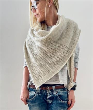 Vaike strikkes med start i den smalle ende i venstre kant. Masker tages ud på hver RS pind i snoningsmønstre og derefter i den glatstrikkede sektion. En fin 3 x 1 ribkant strikkes til sidst. Kombinationen af snoninger, glatstrik og rib giver sjalet et sofistikeret og samtidig afslappet udtryk.
